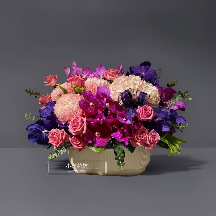 花材:粉繡球 紫天王玫瑰 巨輪蘭花 千代 蘭 進口牡丹菊 季節葉材(3天前預訂)