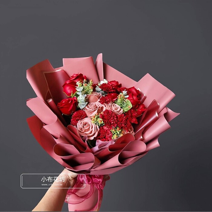 香皂花材:紅康乃馨、 紅玫瑰、奶茶玫瑰、人造葉。
