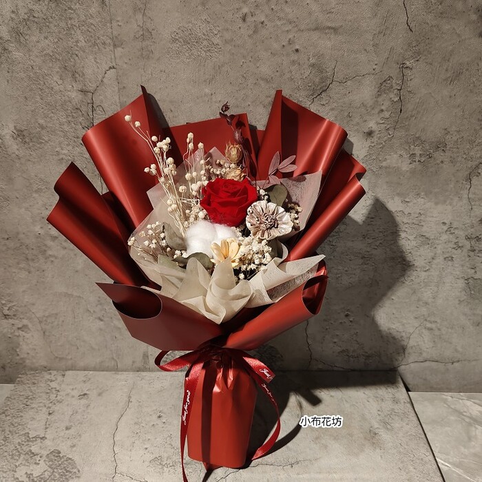 花材:永生花玫瑰1朵搭配乾燥花
