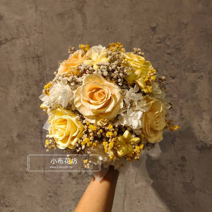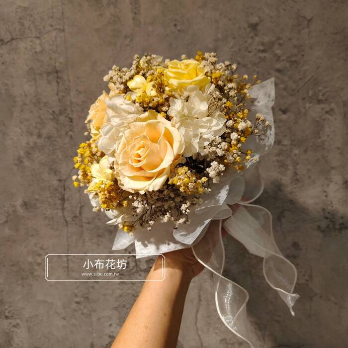 花材:永生黃色玫瑰 永生繡球 乾燥花